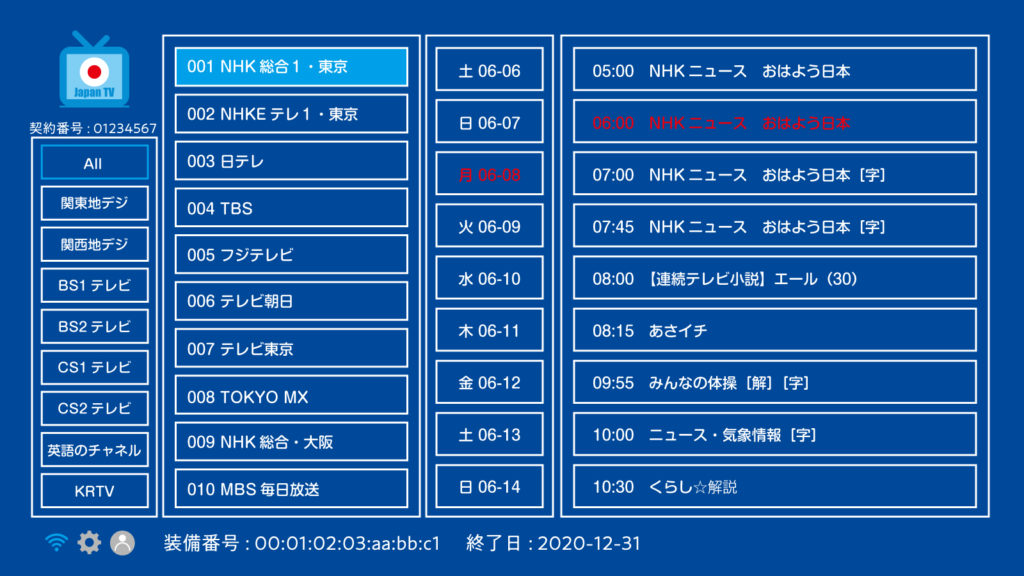 4.チャンネル画面が表示されます。左から、「ジャンル」「チャンネル」「日付」「番組名」が表示されています。